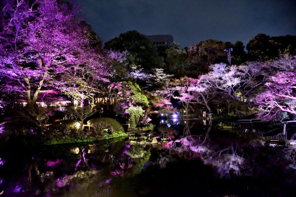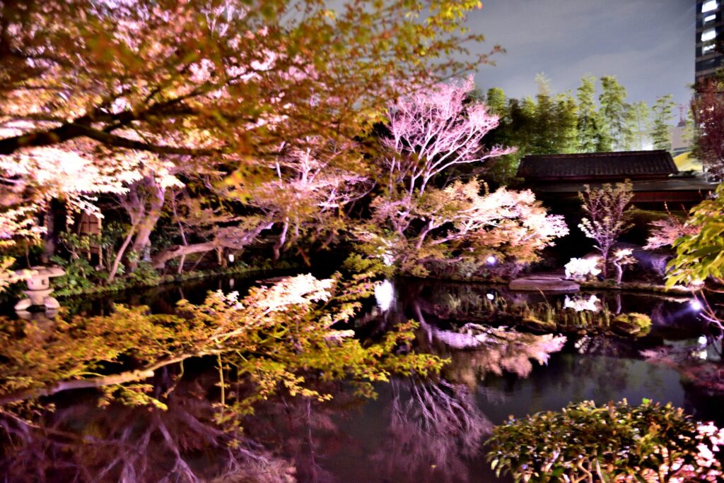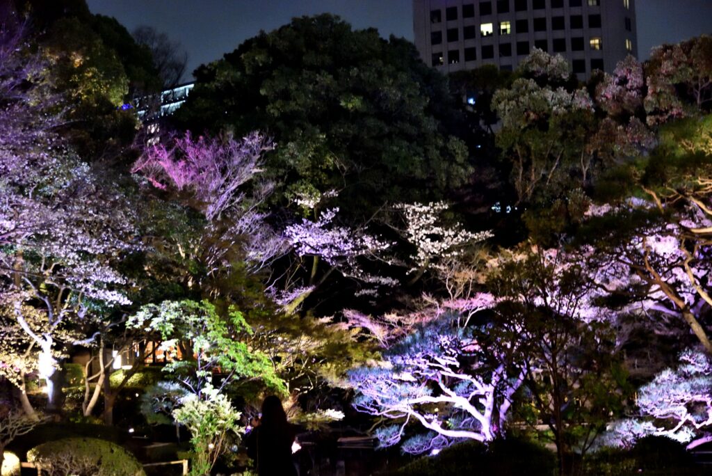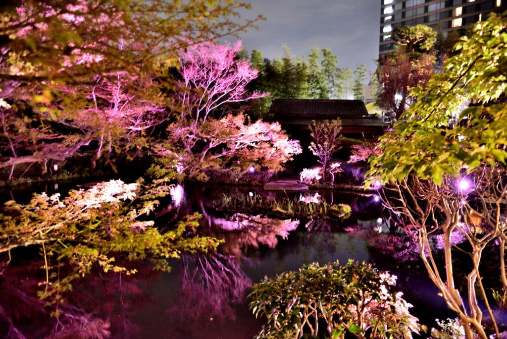 テレビでも紹介されてた 赤坂 ニューオオタニ 日本庭園ライトアップ 一般客は22時まで 一般客は少数 ゆっくり散歩 ライトアップは時間で変化