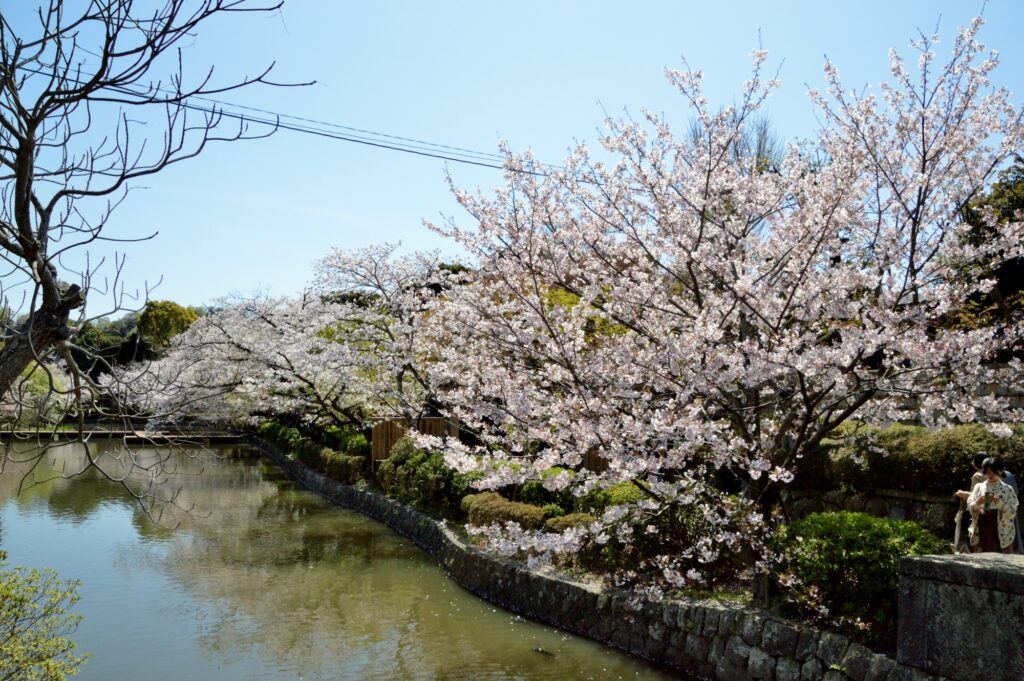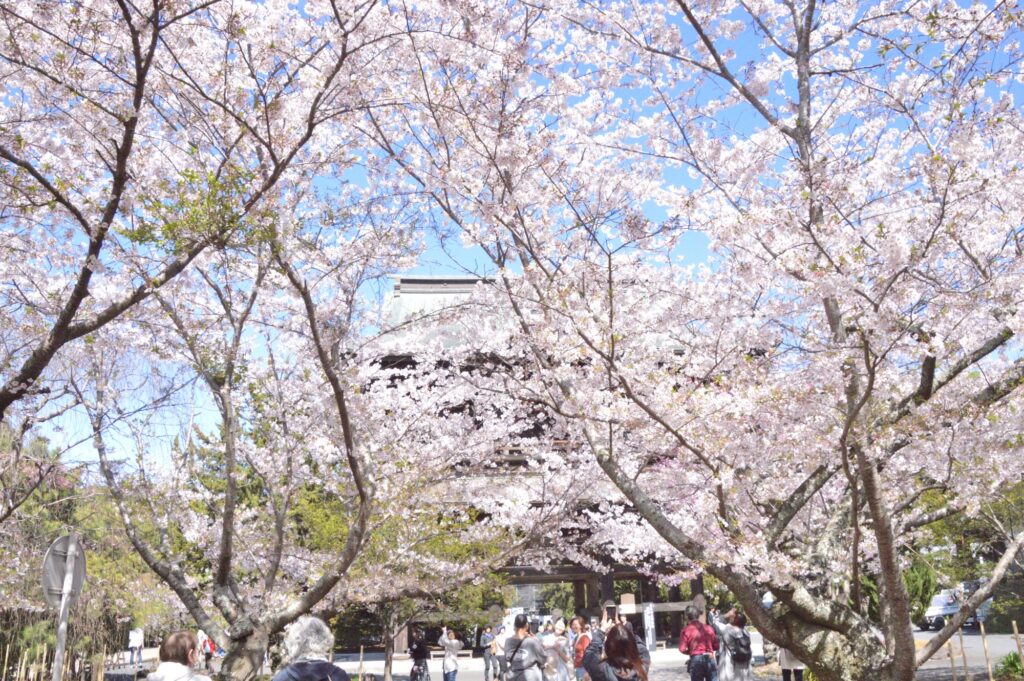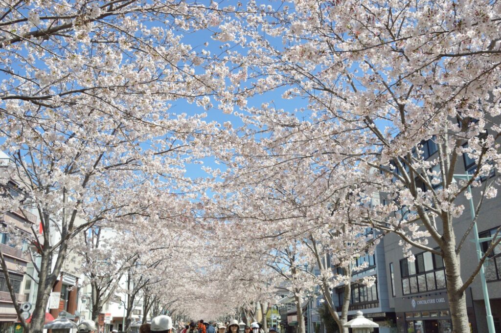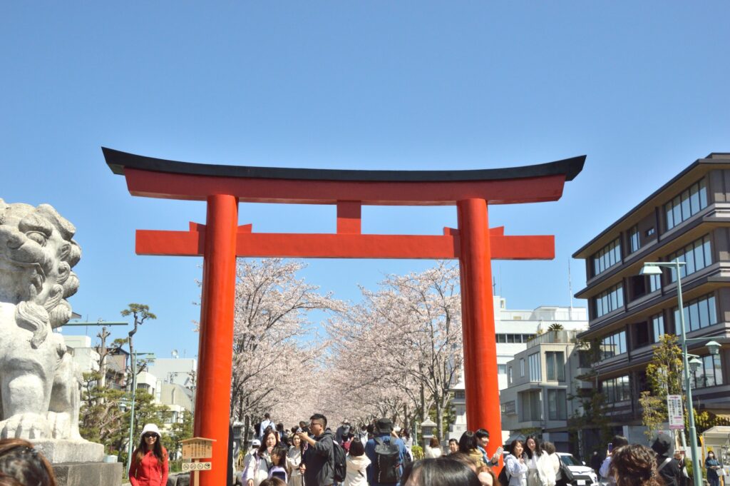 今日は曇りの間の晴れ間 青空 桜が映える 今日は満開 鶴岡八幡宮まで続く「段葛(だんかずら)」は、源頼朝が妻・北条政子の安産を願って築いたとされるこの道は、約500メートルの美しい石畳と、両脇に整然と植えられた桜並木が特徴です